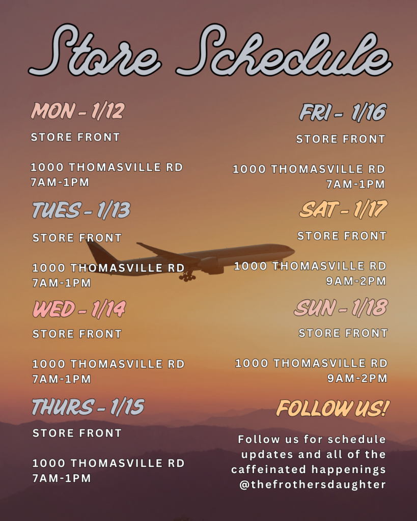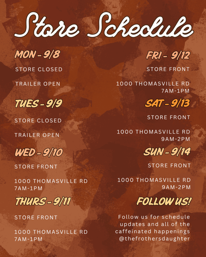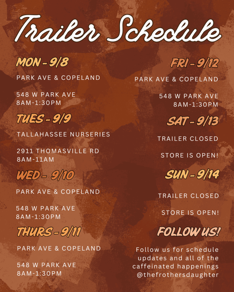 Stay up to date with us by following our Facebook page and Instagram. You can also find this week’s schedule for both the store and trailer posted below. We post our schedule weekly, every Sunday night. Hope to see you soon!